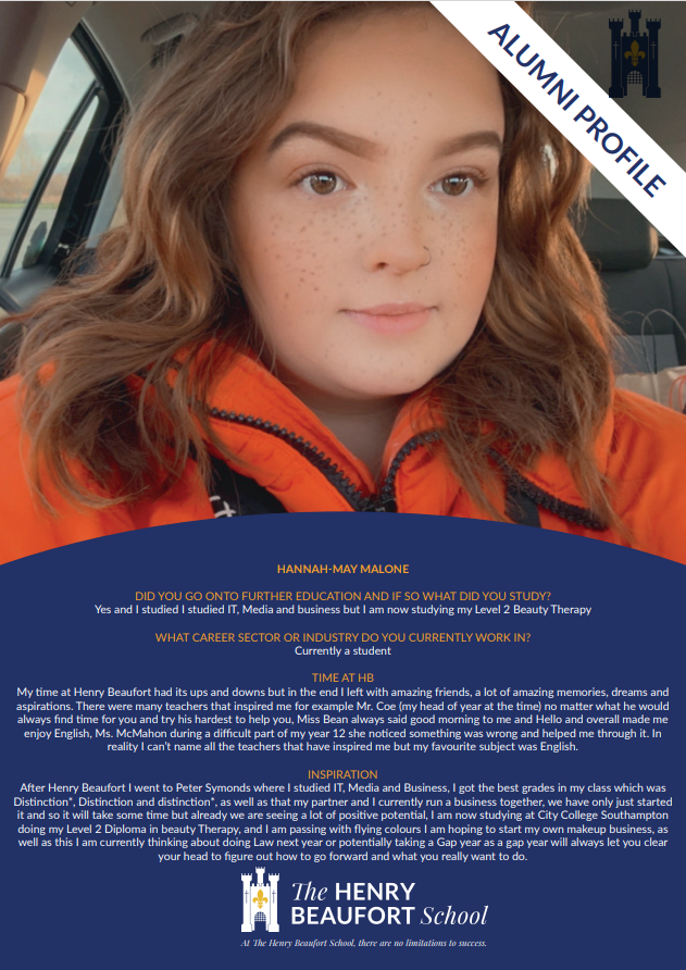 We would love to celebrate the successes of our alumni and share their inspirational stories, achievements, and experiences beyond The Henry Beaufort School. Your journeys serve as a beacon of inspiration for our current students, encouraging them to reach for their dreams.